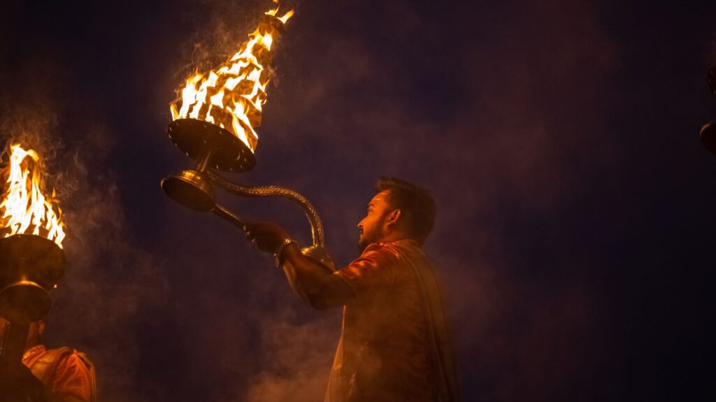 Each evening at sunset, the ghat hosts the mesmerizing Ganga aarti. Priests in saffron robes perform synchronized rituals with multi-tiered flaming lamps, conch shells, and incense to worship the Ganges River, believed to embody goddess Ganga herself. Devotees and visitors gather on the wide steps or boats to witness the glowing firelight against the river’s dark waters, creating a stunning spiritual spectacle.