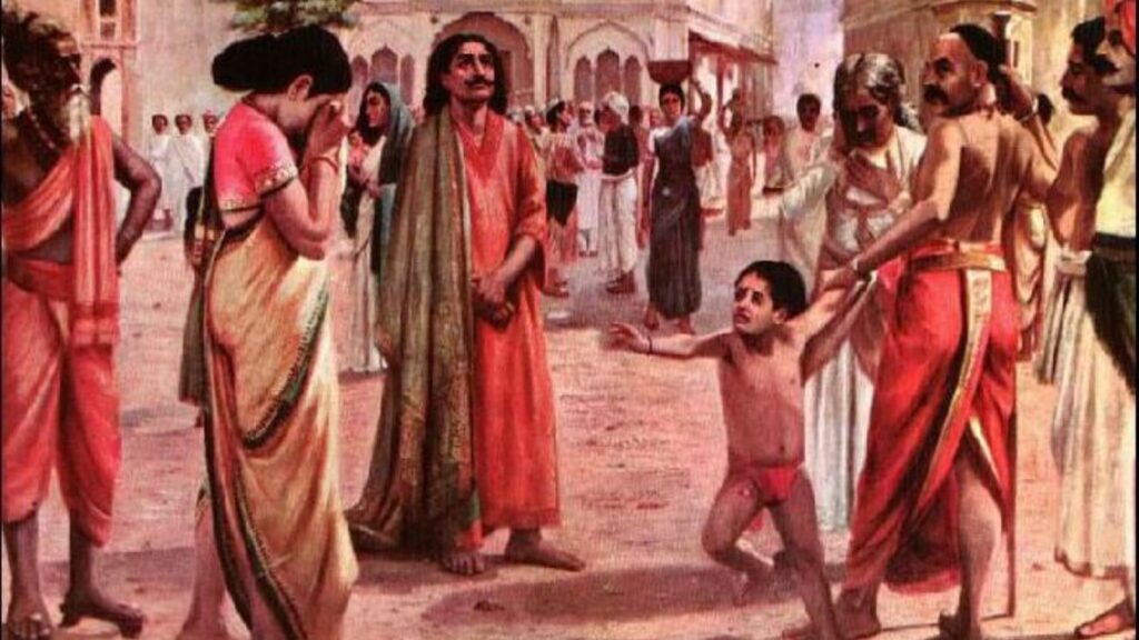A painting by Raja Ravi Varma depicting Raja Harishchandra parting with his wife and son