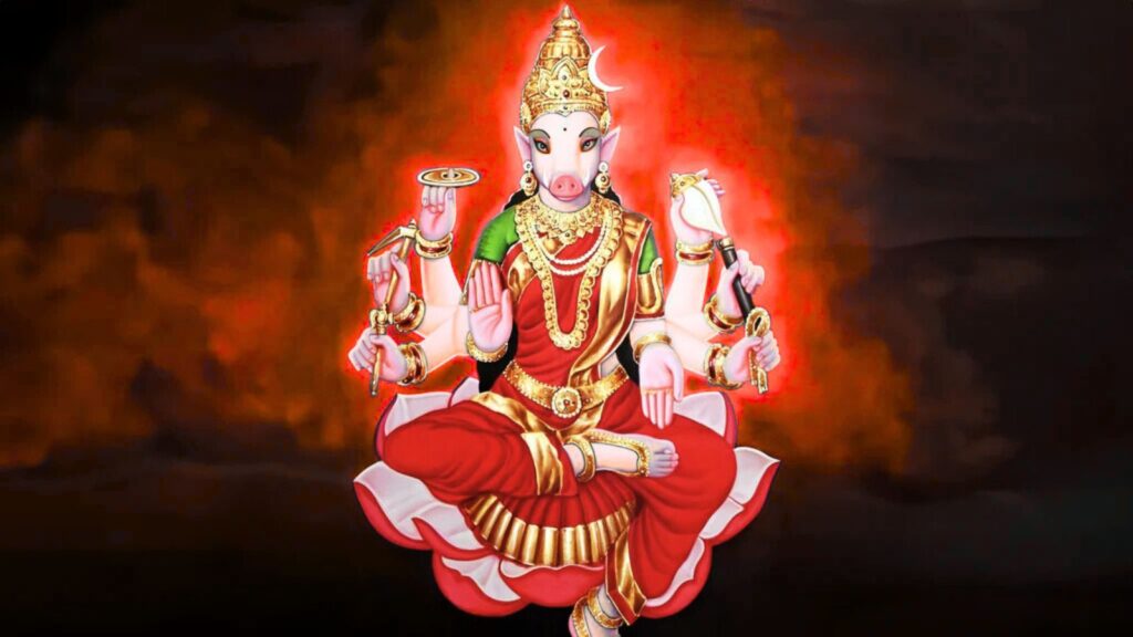 Varahi is regarded as the guardian of Varanasi, watching over the city at night and returning to her temple at dawn. Her role as “gram devata” beautifully interwines with her dual iconography as both destroyer of evil and benevolent mother. She is portrayed bearing swords and a discus, crowned with a Karanda Mukuta and sometimes shown dancing or wielding various weapons